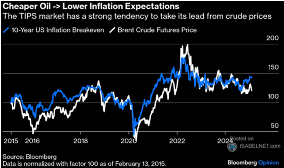 This matters for more reasons than the fact it will be cheaper to fill up your tank at the gas (petrol) station, it is very likely to have a very positive impact on inflation writ large. As you can see from the chart below, there is a very strong correlation between the price of oil and US inflation expectations. Declining oil prices are very likely to help people perceive a less inflationary future and will reduce the rate of inflation by definition.