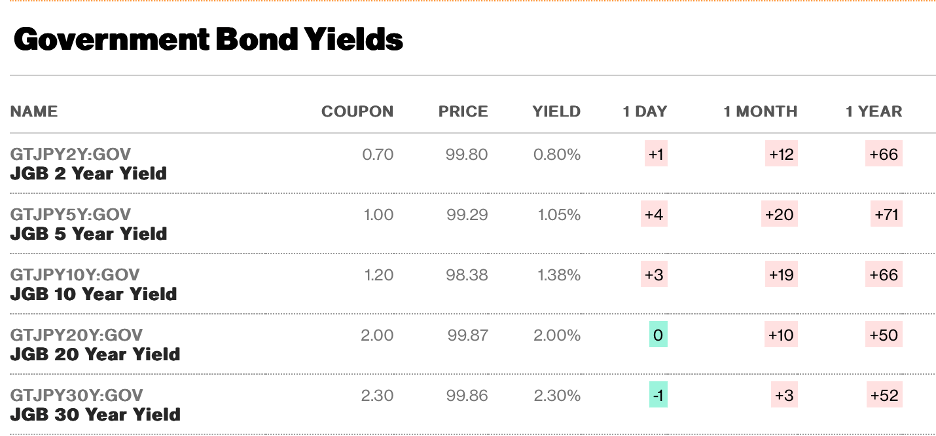 But let us consider, for a moment, what the Japanese rate structure looks like in the context of the current inflation story in Japan. As can be seen below, this is the current shape of the Japanese government bond yield curve, with 2yr yields at 0.80% while 30yr yields are up to 2.30%.