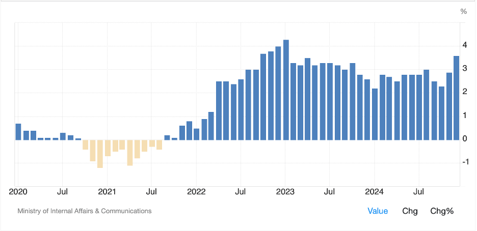 However, when looking at these yields, which as you can see from the column furthest to the right have risen substantially in the past 12 months, we must also remember the pace of inflation in Japan. Since April 2022, every monthly CPI print in Japan has been above the target of 2.0%, with all but two of them above 2.5%. In fact, as you can see from the chart below, the most recent data, as of December 2024 with the January data to be released Thursday night, shows the headline at 3.6%. That is nearly three years of inflation data running above their target, yet the BOJ is unwilling to say inflation is stably at 2.0%. I guess they are correct, it is stably at about 3.0%!