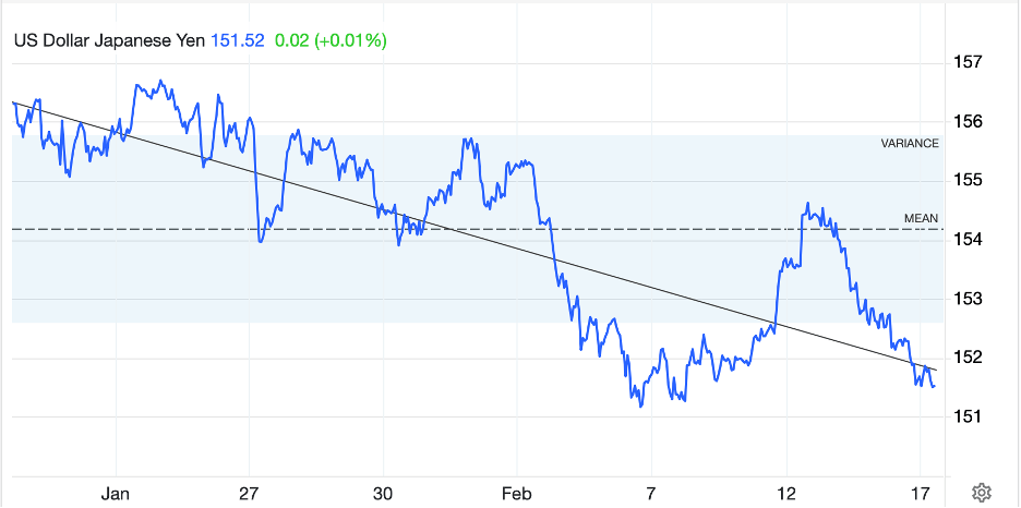 On this President’s Day holiday, when US markets are closed, arguably the most interesting financial story around is in the Land of the Rising Sun where Q4 GDP was released last night at 0.7%, significantly higher than forecast (0.2%) and Q3’s outcome (0.4%). Japanese markets responded about as might be expected with the yen (+0.6%) rising alongside JGB yields (+3bps) with the 10yr now at 1.38%, its highest level since March 2010. As to equity markets, the Nikkei (+0.1%) was caught between the positive GDP news and the stronger JPY. Of course, much has been made of the BOJ’s overnight rate, which now sits at 0.50% after several hikes during the past year. As well, expectations are for further hikes this year, with several analysts calling for a rate over 1.00% before the end of 2025.