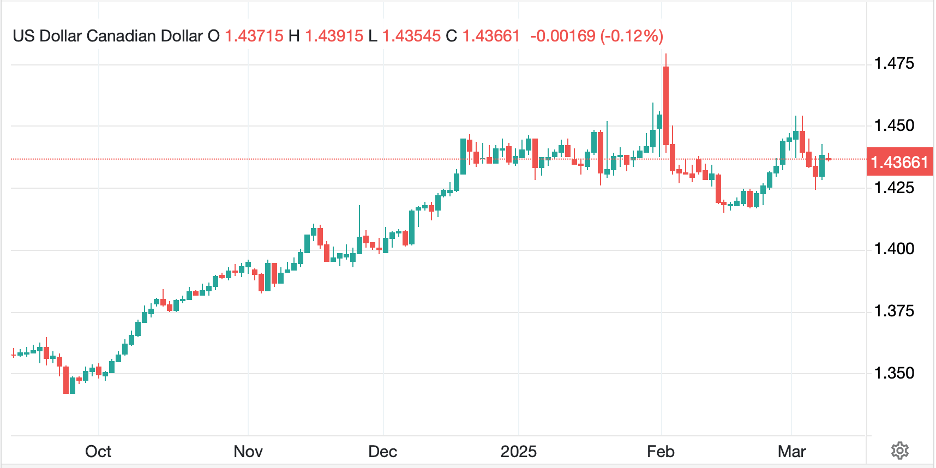 Here’s the thing, though.  Despite much angst about the US-Canada relationship on the Canadian side of the border, the market viewpoint is nothing has really changed.  a look at the chart below shows that after a bout of weakness for the Loonie in the wake of the US election and leading up to Trump’s tariff announcements, USDCAD is basically unchanged since mid-December, with one day showing a spike and reversal in early February.  My point is that the market has not, at least not yet, determined that the Canadian PM matters very much.