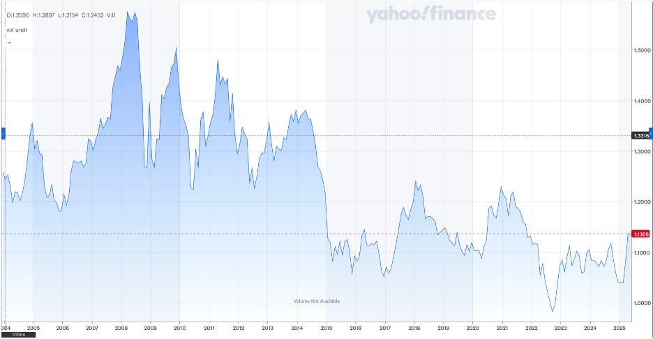 One of the reasons is that the dollar remains under pressure. Last night, further weakness was manifest with the euro trading back close to the highs touched on Friday at the 1.14 level. Prior to Friday, the last time the euro was here was in February 2022. But again, like the yen chart above, the euro’s strength is a very recent, short-term phenomenon. A look at the chart below demonstrates just how “weak” the dollar is vs. the single currency on a long-term basis. The answer is not very.