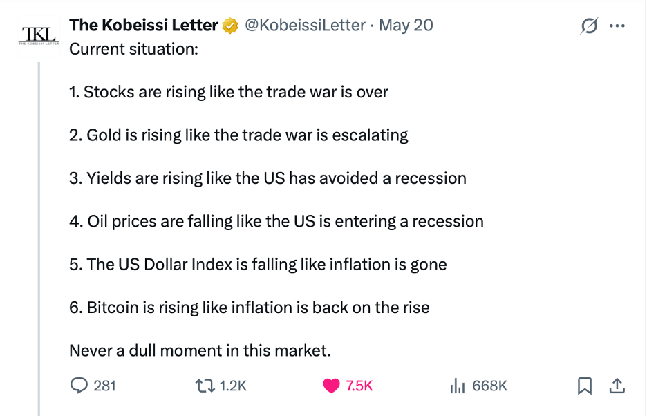 But on to less important, but more topical things. A week ago, an X account I follow, The Kobeissi Letter, posted the following which I think is such an excellent description of why we are all so confused by the current market gyrations.