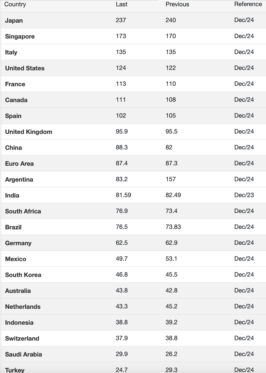 On the other hand, we cannot forget the debt situation, which is an undeniable drag on economic activity. Forgetting the numbers per se, the fact that the US debt/GDP ratio is at wartime levels during peacetime (well, US peacetime) with no obvious end to the spending is a key concern. But it is not just the US with a growing debt/GDP ratio. Here is a listing from tradingeconomics.com of the G20’s ratios. (Russia is the bottom of the list but not relevant for this discussion.)