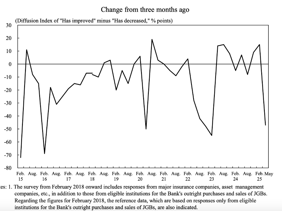 As it happens, last week the BOJ held one of their periodic (actually, the 22nd) “Bond Market Group” meetings in which they discuss with various groups of market participants the situation in the JGB market regarding liquidity and trading capabilities and the general functioning of the market. The two charts below, taken from the BOJ’s website (H/T Weston Nakamura) demonstrate that there is growing concern in the market as to its ability to continue along its current path.