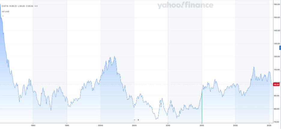 Before we go to markets, I have to highlight one other market discussion this morning with Bloomberg publishing two different articles, here and here, on the end of the dollar’s hegemony. The first highlights a speech by PBOC governor Pan Gongsheng and his vision of a multicurrency world which, of course, includes the renminbi as a major part of the process. I will believe that is a possibility as soon as China opens its capital accounts completely and allows flows into and out of the country with no restrictions. (I’m not holding my breath.) The second takes the Michael Bloomberg Trump hatred in the direction of the president is destroying the dollar’s reign because of his policies and to highlight the dollar has fallen 10% already this year! But let us look at a long-term chart of the dollar, using the DXY as a proxy, and you tell me if you can see the recent move as being outsized in any sense of the word. In fact, the dollar’s recent price action is indistinguishable from anywhere in its history, and it is not anywhere near to its historic lows. In fact, it is just a few percent below its long-term average.