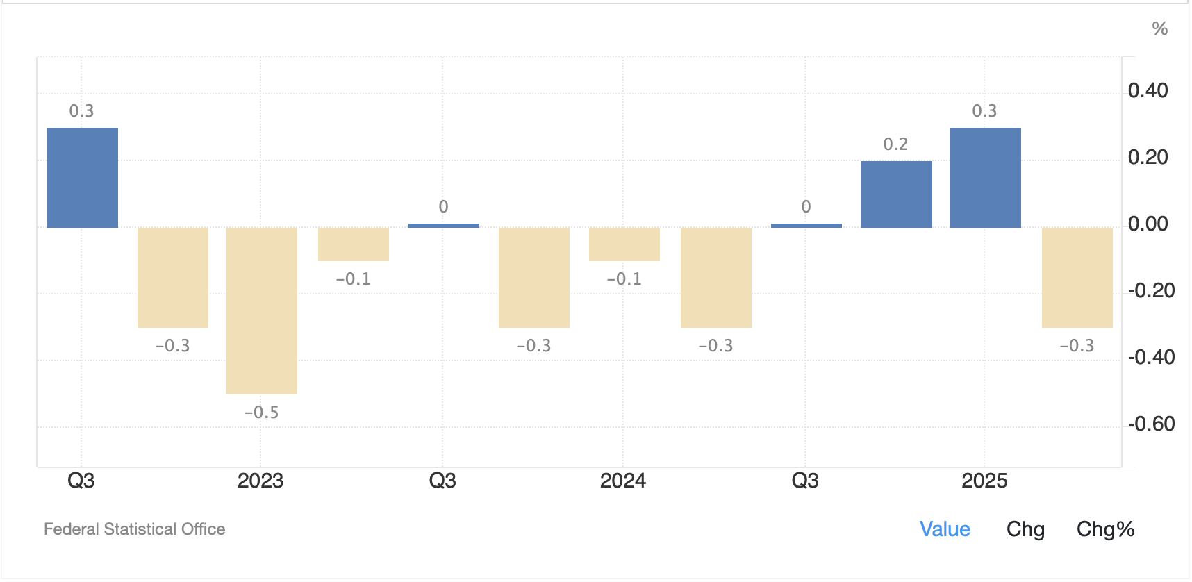 Germany GDP data (-0.3% Q/Q, +0.2% Y/Y) was a few ticks lower than expected and continues to point to an economy that has no positive momentum at all.  In fact, a look at the quarterly GDP data from Germany paints a pretty awful picture if growing your economy is the goal.