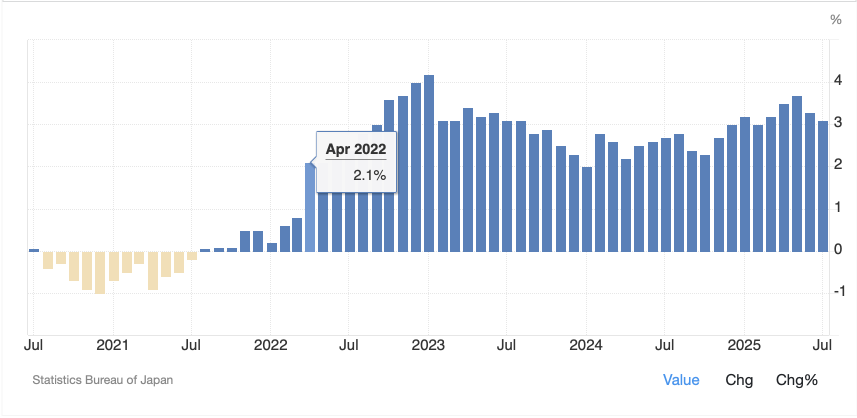 Turning to Japan, inflation continues to run far above their 2.0% target, printing last night at 3.1% on both the headline and core metrics, which while 2 ticks lower than June’s data, was still a tick higher than expected.  It has now been 40 consecutive months that core CPI in Japan has been above the BOJ’s 2.0% target and Ueda-san continues to twiddle his thumbs regarding raising rates.