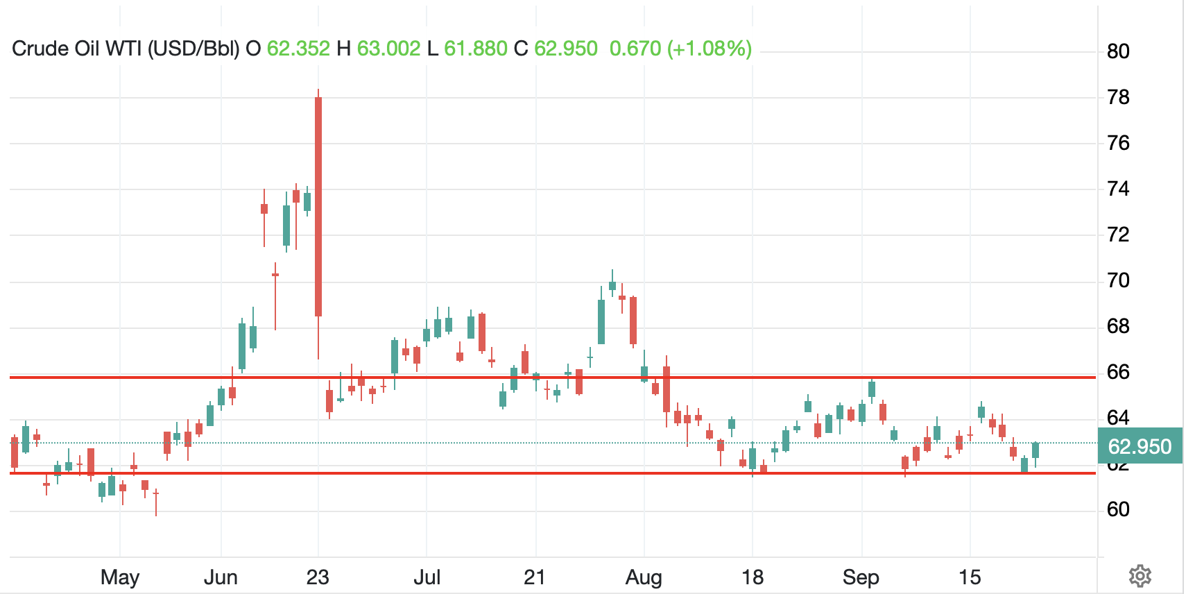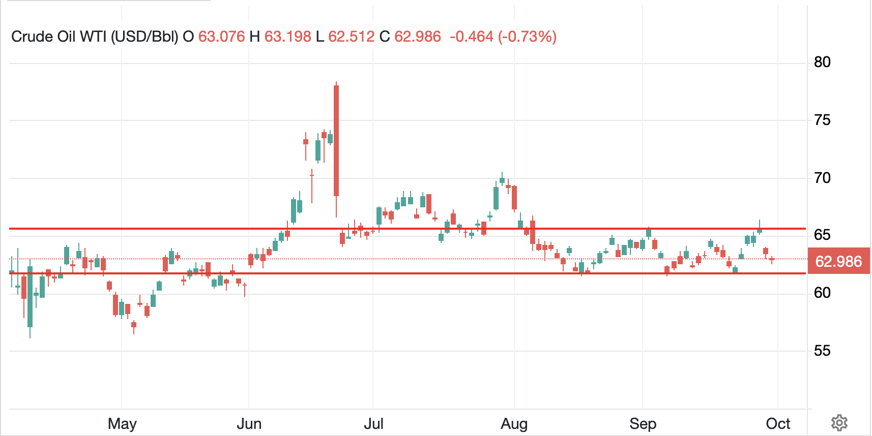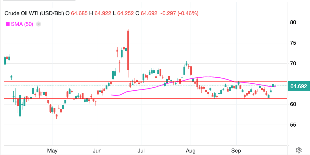 As has been the case for a while now, the biggest moves have come in the commodity space with oil (-0.7%) falling back to the middle of its trading range as per the below chart from tradingeconomics.com.