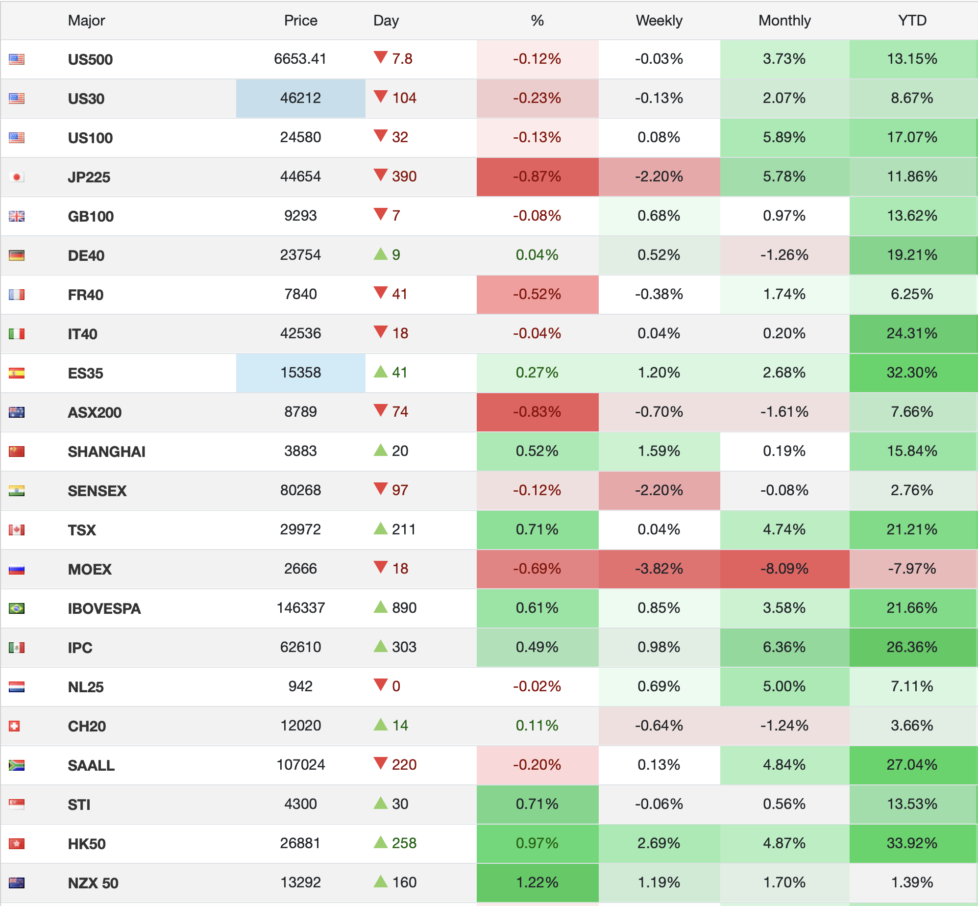 But here’s the thing about stocks, no matter how much angst some folks have had, and how many calls for recession have been made, and how much people may hate President Trump, below is a table from tradingeconomics.com showing most major stock market indices and their performance YTD at the far right. Take away Russia, which isn’t really major, and there is an awful lot of green!