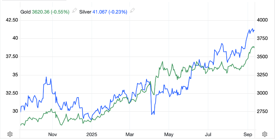 In the commodity space, oil (-1.25%) is giving back the gains it saw earlier in the week but basically remains unchanged overall. If fears grow that a recession is upon us, I could see a rationale for oil to decline, but it is hard to get excited about the market right now. Gold (-0.6%) is backing off its most recent all-time high, but is still firmly above $3600/oz. Given the recent run, it is no surprise it takes a breather here and there is no reason to believe that precious metals are topping out. In fact, a look at the charts tells me that there is plenty of upside left across the space.