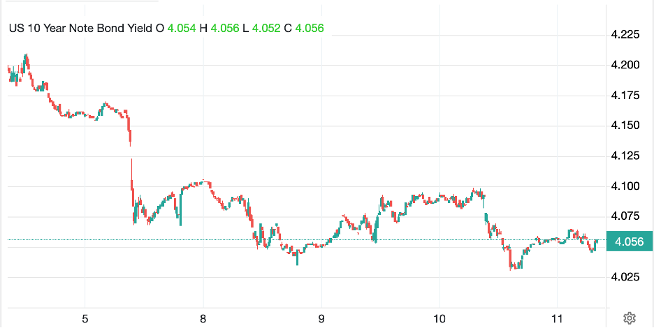 Bond markets remain frozen as Treasury yields have edged higher by just 1bp and European sovereign yields are +/-1bp from yesterday’s close. As you can see from the chart below, the range on 10-year Treasuries has been fairly narrow for the past week. Perhaps today’s CPI will shake things up.