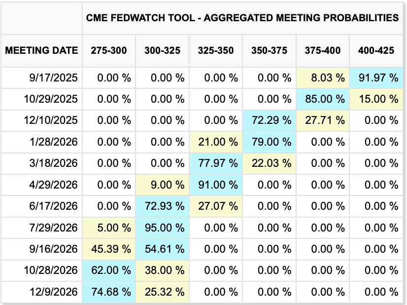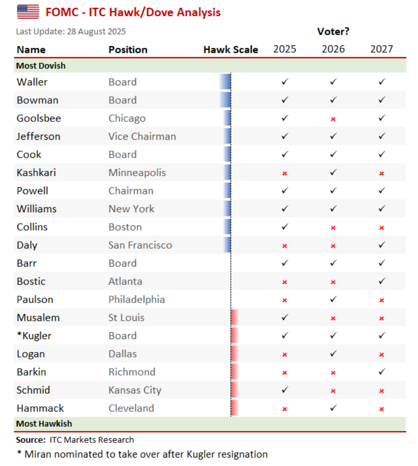 ITC Markets has a very nice table on the perceived hawkishness/dovishness of FOMC members, and it shows that the governors, as a whole, live in the dovish camp with only a few regional presidents as known hawks. In fact, one of the remarkable things about the entire Lisa Cook affair is that she was always one of the more dovish members of the board and the fact that she was not pushing for cuts never made any sense. At least based on her background and history. However, if you take politics into account, and the idea that she didn’t want to cut because President Trump wanted a cut, it begins to become clearer. At any rate, it strikes me that based on this table, which feels reasonable, 50bps is in play.