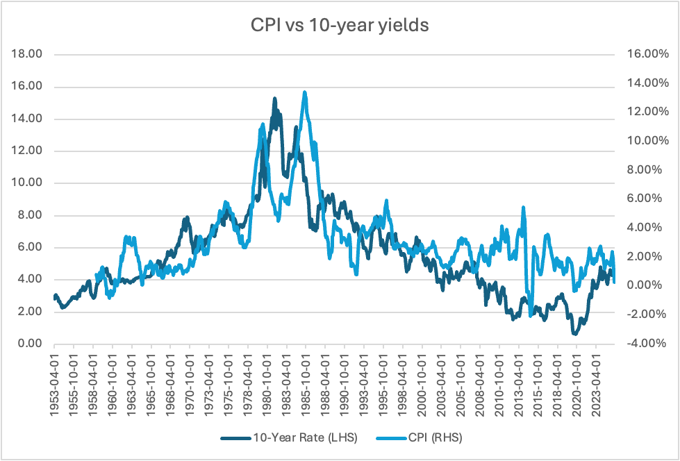 It is far too early to claim the outcome will be the same this time, but it is a real risk. After all, bond yields have a strong relationship with inflation, running at a long-term correlation of 0.36 and as can be seen in the chart below I prepared from FRED data.