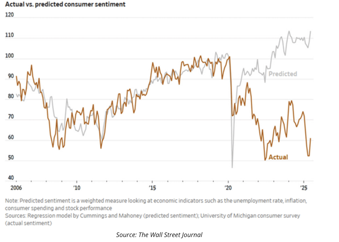 It is quite apparent how this particular model, which appears to use the type of inputs that most econometric models utilize, had done a pretty good job, even throughout the GFC, of anticipating changes in consumer sentiment right up until Covid. However, it is also clear that since then, it has a terrible track record.