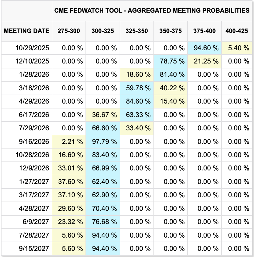 Perhaps the most interesting thing is that despite there being a pretty even split between those expecting two more rate cuts this year and those expecting no more rate cuts this year, the Fed funds futures market is still pricing a 95% probability for a cut at the end of this month and a 79% probability for a second cut in December as per the below CME table.