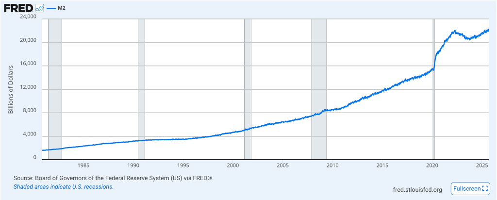 There has been much discussion as to the nature of the recent rise in asset prices with many pundits calling it the everything bubble. Bubbles are created when central banks pump significant liquidity into the system and this is no different. We know the Fed has allegedly (look at the graph of M2 below to see how much they have been increasing money supply during their tightening) been trying to reduce its balance sheet (i.e. liquidity) but this could well be a sign that phase is over. Typically, the next step is QE in some form, so beware. And when that comes, you can be sure that gold will rally sharply once again!