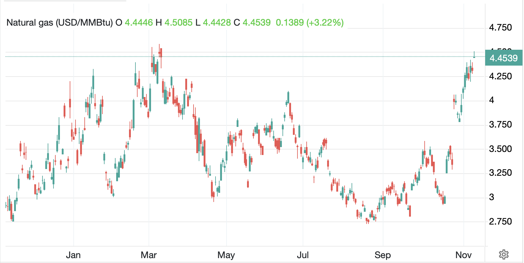 In the near term, as winter approaches, meteorologists are forecasting a much colder winter in the Northern Hemisphere across both North America and Europe, something that is going to have a direct impact on NatGas. Bloomberg had a long article on the topic this morning with the upshot being that the Polar Vortex may break further south early this year and bring a lot of cold weather along for the ride. This is clearly not new news to the NatGas market, as evidenced by the fact that its price has exploded (no pun intended) higher by 43% in the past month!