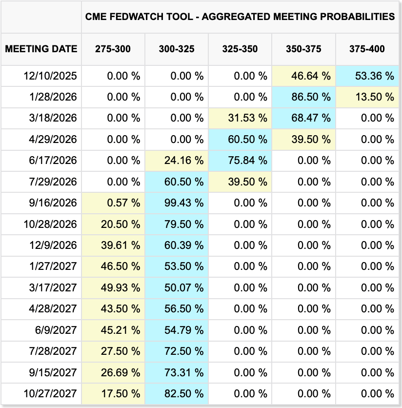 I highlight this because the tone of virtually every one of these speeches has been one of caution, with the implication being they are very close to their nirvana so the last steps will be small. However, we cannot forget that though the last steps may be small, there is still confidence amongst the entire body that the direction of travel is toward lower rates. certainly, as you can see from the aggregated meeting probabilities from the Fed funds futures market below, there is zero expectation that rates will rise anytime during the next two years and a decent chance of another 100bps of cuts over that time.