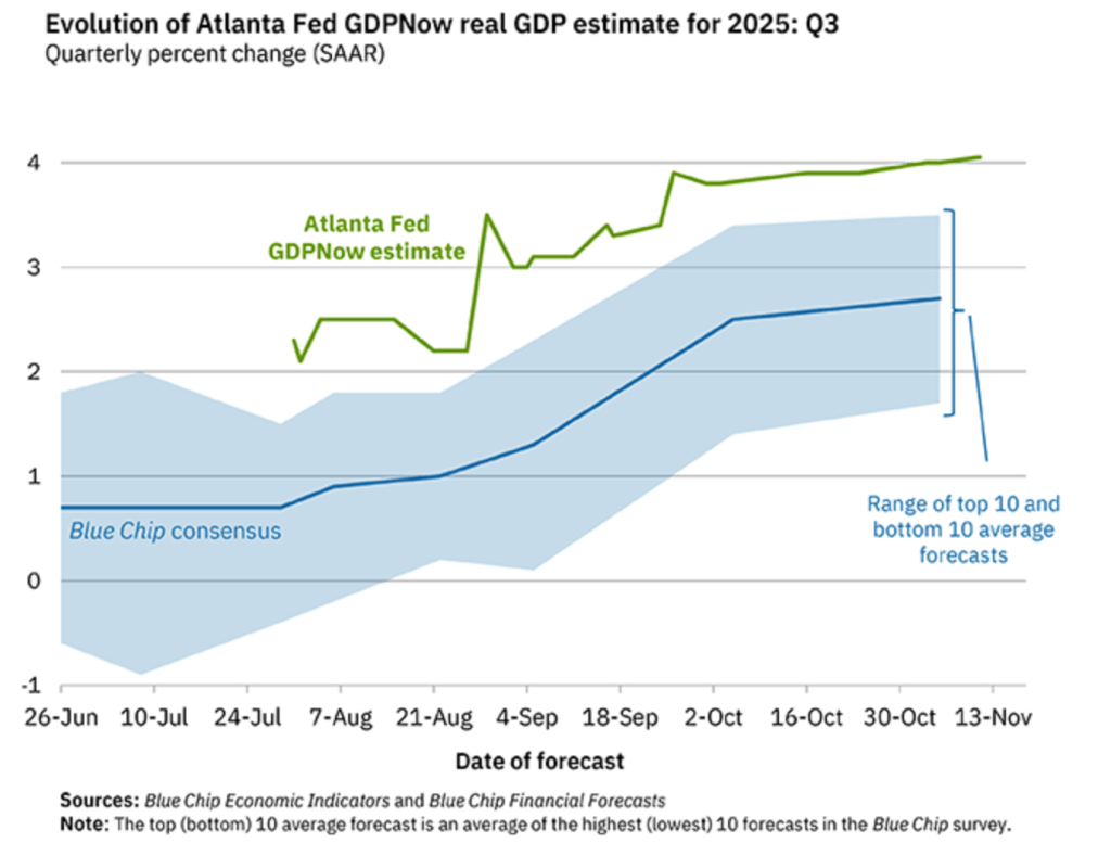 Asking Grok, the average current earnings growth forecasts for 2026 for the S&P 500 is somewhere in the 13% – 14% range with revenue growth running at ~6.9%, which is typically in line with nominal GDP growth. (I understand that current forward PE ratios are extremely high at 23x, so be careful that companies hit their targets while their share prices fall anyway.) But if nominal GDP is going to run at nearly 7%, and let’s assume inflation is at 3.5%, which I think is a reasonable possibility, then the math tells us that GDP is growing at 3.5% on a real basis. With Fed funds currently at 4.0%, why would they need to decline further?
