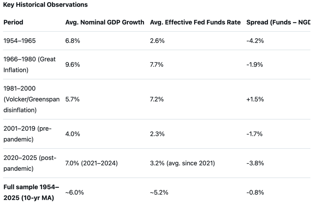 Here’s something else to ponder, I asked Grok about the relationship between nominal GDP and Fed funds and the below table is what it produced: