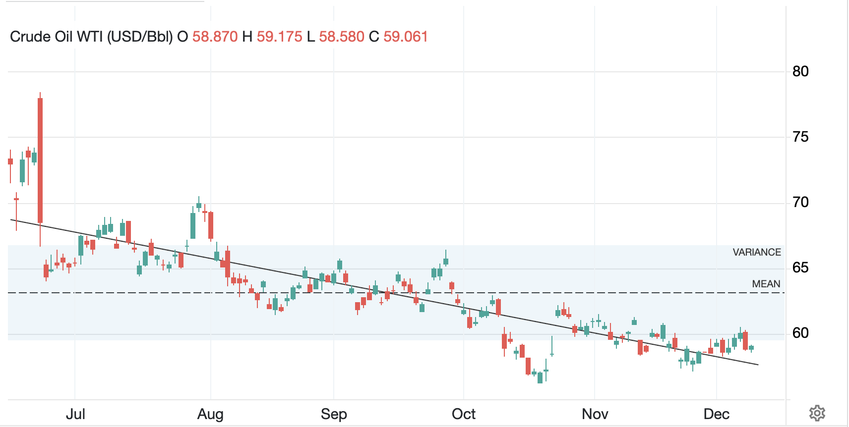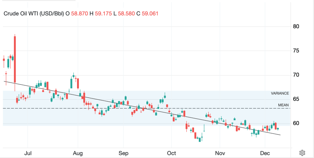 In the commodity markets, while the trend remains slightly lower in oil (+0.3%), as you can see from the chart below, $60/bbl is home. As I have written before, absent an invasion of Venezuela or peace in Ukraine, it is hard to see what changes this for now. I guess if China stops filling up its SPR, demand could shrink and that would accelerate the decline.