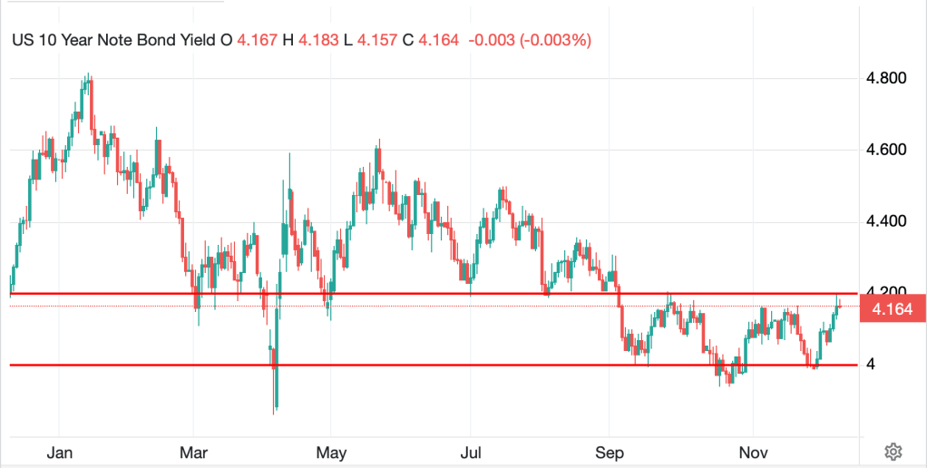 Markets continue to be dull these days. While we are clearly not in the summer (it is 15° here in NJ this morning), doldrums certainly seem to be descriptive of the current situation. Equities bounce back and forth each day, neither trading to new highs, nor falling sharply. The same is true with the dollar, with oil, with gold of late and even, on a slightly longer-term view, of Treasury bonds. I guess that could be the exception, depending on your horizon, but as you can see from the chart below, it has been several months since 10-year yields have traded outside the 4.0% – 4.2% range.