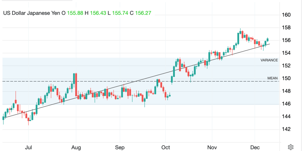 Finally, the dollar, which rallied a bit yesterday, is little changed this morning. USDJPY is interesting as it has traded back above 156 this morning, contradicting all that talk of a Japanese repatriation trade. Again, it is difficult for me to look at the yen chart below and conclude the dollar has peaked.