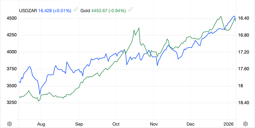 Finally, the dollar is still there, and vs. most of its counterparts, doing very little this morning. the outlier today is ZAR (-0.5%) which is obviously hurting on the back of gold and platinum’s weakness. In fact, it is worth looking at the relationship between ZAR and gold, as per the below chart, to help you understand just how closely tied is the price action between the two.