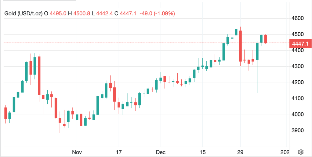 We’ve already discussed oil, but metals, which is where the real action has been, are all lower this morning, very clearly on profit taking activity. Consider that gold (chart below from tradingeconomics.com) has been the least remarkable and still rallied 4% since the beginning of the year, so slipping -1.2% this morning can be no surprise.