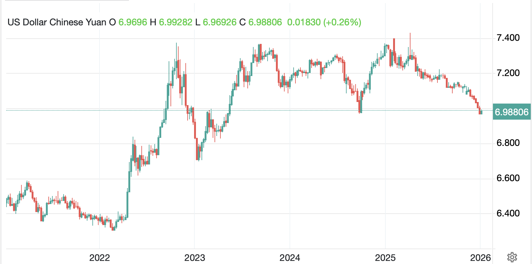 The other currency that has been trending steadily is CNY, with it breaching the 7.00 level at the end of 2025 for the first time since September 2024. While this trend has been steady for the past year, a look at the longer-term chart shows the renminbi is nowhere near an extreme in either direction.