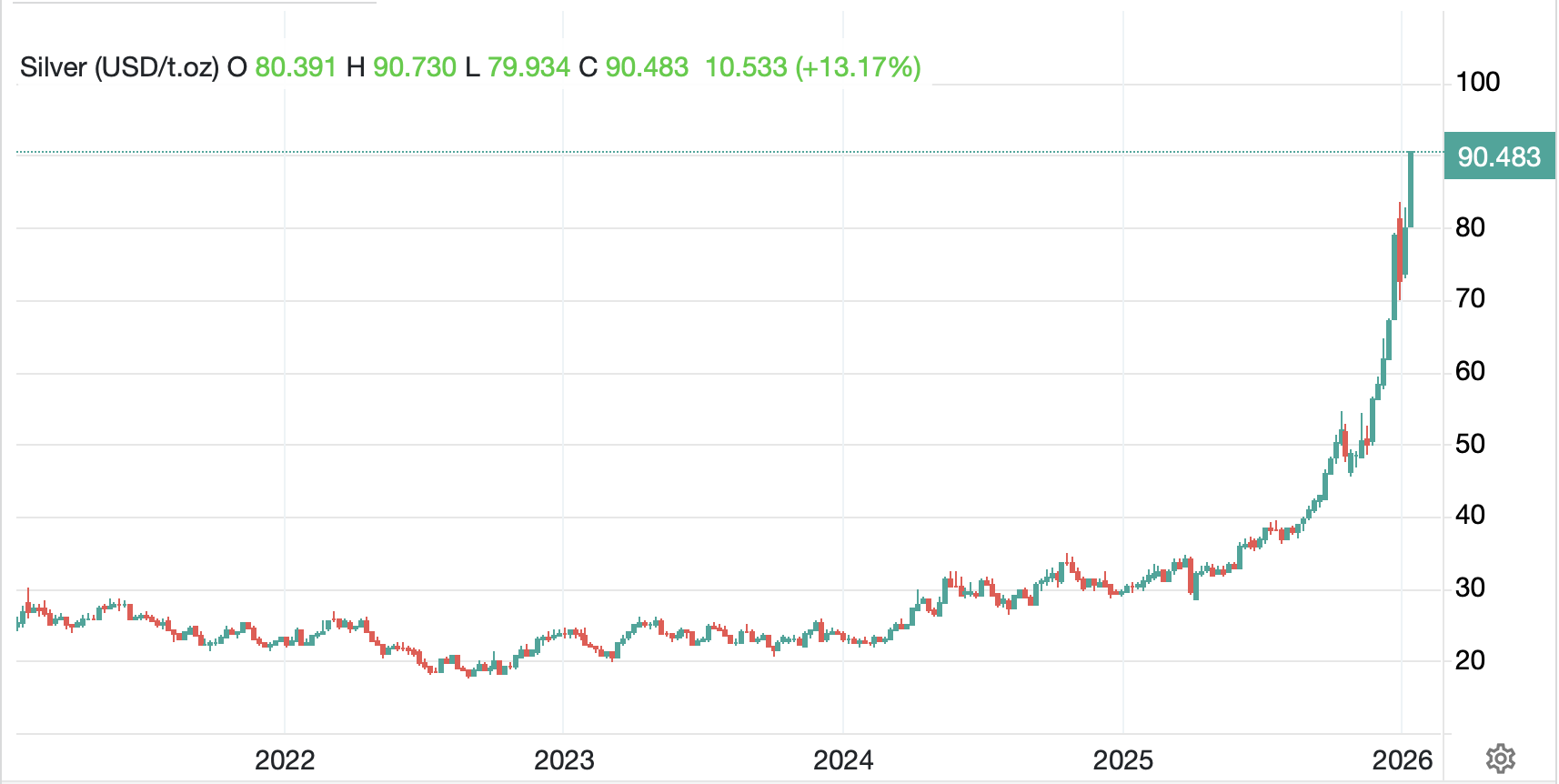 As to the rest of the market, precious metals continue to be the shining stars with the whole sector higher this morning (Au +1.0%, Ag +4.2%, Pt +2.0%) and that move taking copper (+0.4%) along for the ride. Last night the CME raised its margining requirement and changed its nature by requiring a percentage of the value, rather than a numeric amount per contract. My friend JJ, who writes the Market Vibes substack wrote a brilliant piece last night explaining how the flows are evolving in the silver market. To sum it up, at this point, there appears no end in sight for the demand as short positions are covered by new shorts. Metal for delivery remains scarce and despite the extraordinary shape of the move, it appears to have more steam to drive it forward. Markets like this are extremely difficult to trade, and history shows that movements in the shape seen below reverse very sharply. But as Keynes explained 100 years ago, markets can remain wrong longer than you can remain solvent. I am happy I have been long silver for quite a while but am having a hard time figuring out what to do now!