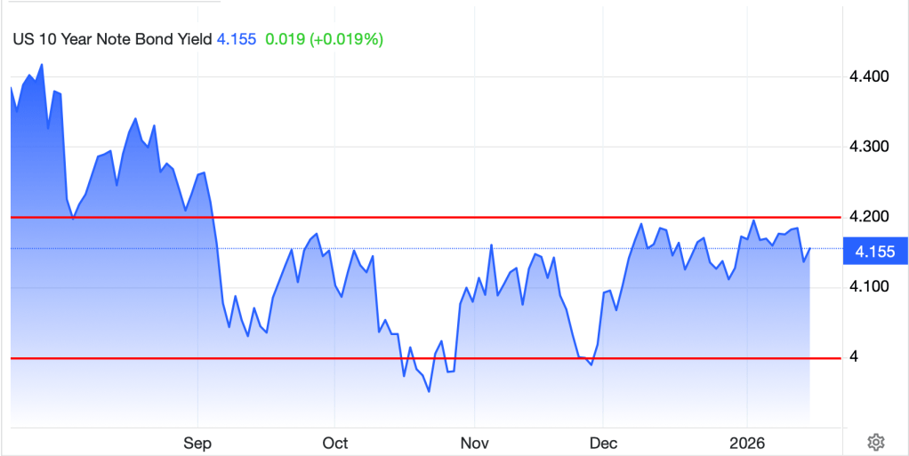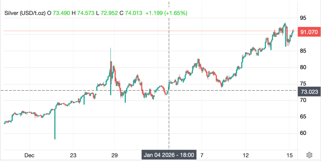 As much activity and new news that has been part of the process over the past several weeks, today is one of those days when it appears we may be able to step back and catch our collective breath. One thing I have observed throughout my career on trading desks is that no matter the underlying news, narrative or data, traders, even algorithms, can only remain in a frenzy for so long. Consider it has been nearly two weeks of nonstop news since the US exfiltration of former Venezuelan president Maduro, yet some markets have exploded. Silver is probably the poster child for this price action and as you can see below, since markets reopened after that news, gold’s little brother has risen nearly 25%, including today’s modest -2.3% retracement.