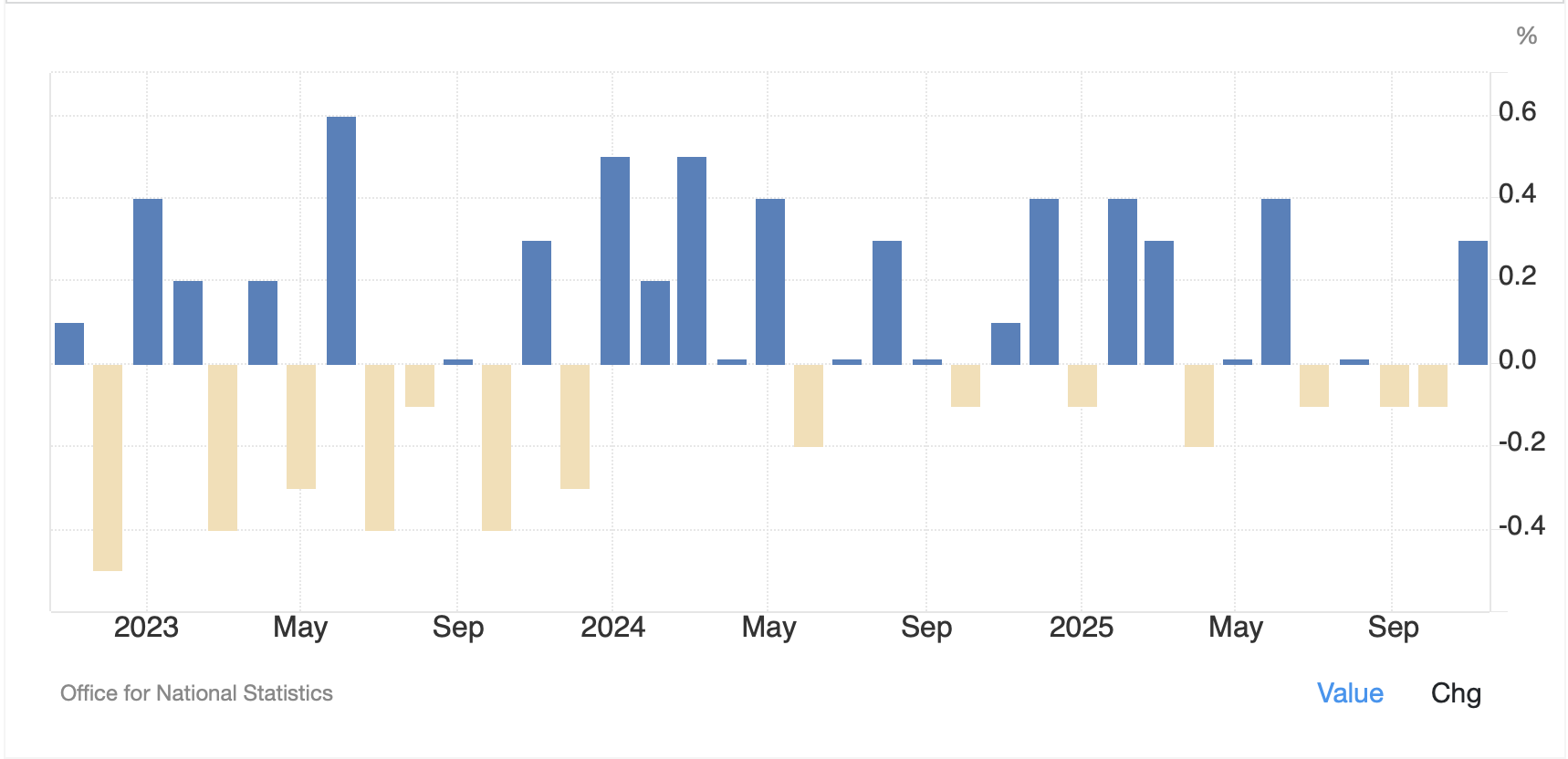 European bourses are also mixed (Germany -0.1%, France -0.3%, Spain -0.1%, UK +0.4%) with the UK benefitting from a stronger than expected GDP report where growth jumped to 0.3% on the month, well above expectations of a 0.1% increase. But a look at the chart below indicates one ought not get too excited about the economic growth in the UK with 14 negative months in the past 3 years.