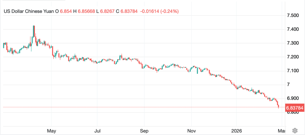 Finally, the dollar is modestly stronger this morning with the yen’s rise the exception in the G10 space (EUR -0.1%, GBP -0.2%, AUD -0.2%, CHF -0.3%, NOK -0.3%).  In the EMG bloc, we are seeing similar modest weakness across the board (PLN -0.2%, ZAR -0.3%, MXN -0.2%) with the outlier here being CNY (+0.2%).  Regarding the renminbi, the Chinese have been marching it slowly higher for the past year, as per the below chart.  My take is President Xi is very focused on convincing others the CNY is a viable reserve currency candidate despite all the capital flow restrictions.  I’m not sure how that would work, but that is the best I can come up with.