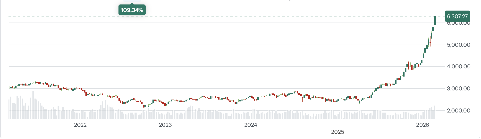 Turning to equities, yesterday’s solid US performance was followed by mixed outcomes in Asia (Tokyo +0.3%, HK -1.4%, China -0.2%) in the major markets while most other regional bourses saw modest gains or losses with no driving stories.  The exception to this was Korea (+3.7%) which has been on an amazing tear lately, as the two largest market cap stocks there, Samsung and SK Hynix, continue to explode higher on demand for memory chips.  In fact, I think it is worthwhile to visualize this move as it is rare for equity markets to go parabolic like this.