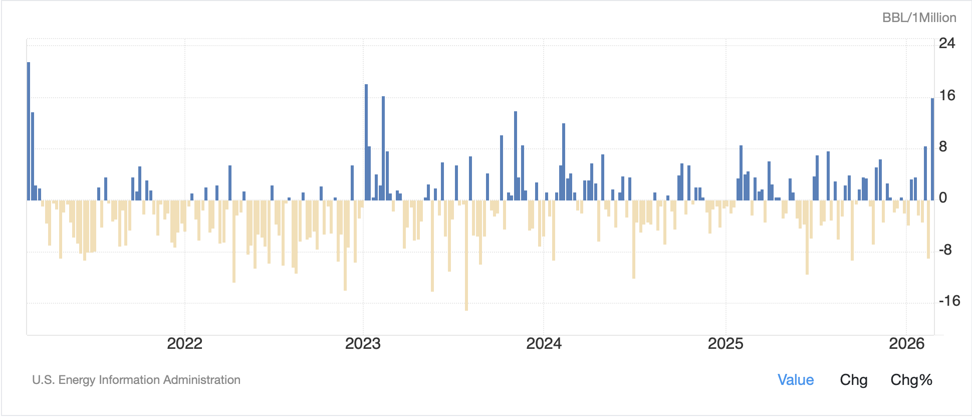 In the commodity space, oil (-1.7%) has softened substantially this morning as the absence of a war in Iran weighs on long positions, but more importantly, I believe, yesterday’s EIA data showed a massive build of inventories of 16mm barrels, far higher than expected and the largest build since February 2023.  Back then, it appeared to be the residual response to the Russian invasion of Ukraine as there was a scramble for barrels.  Perhaps this is a signal that in the event of a war, there is supply around.  If you look at the inventory chart below, we have certainly seen a net build over the past three years.  Again, it is hard for me to look at things like this and see significantly higher prices in the future.