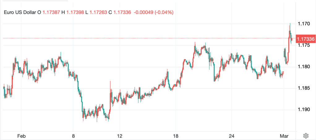 Not surprisingly, we have seen some large moves across markets, and largely in the direction one would have expected regarding risk.  So, oil prices (+7.5%) have exploded higher as shipping through the Strait of Hormuz has ceased for now and there is no timeline for it to reopen.  Given ~20% of the daily global consumption of oil flows through that waterway, there should be no surprise here.  You can see from the chart below that as concerns grew regarding military action, oil’s price climbed and then, of course, gapped on the opening last night.