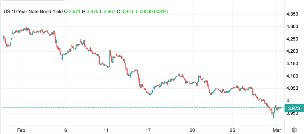 The treasury move was interesting as the initial trade, at last night’s opening, was for lower yields as per the chart above, but that has since reversed.  It could be investors are concerned over additional defense spending blowing out the deficit further but there is no clear signal or commentary I have seen yet on the subject.