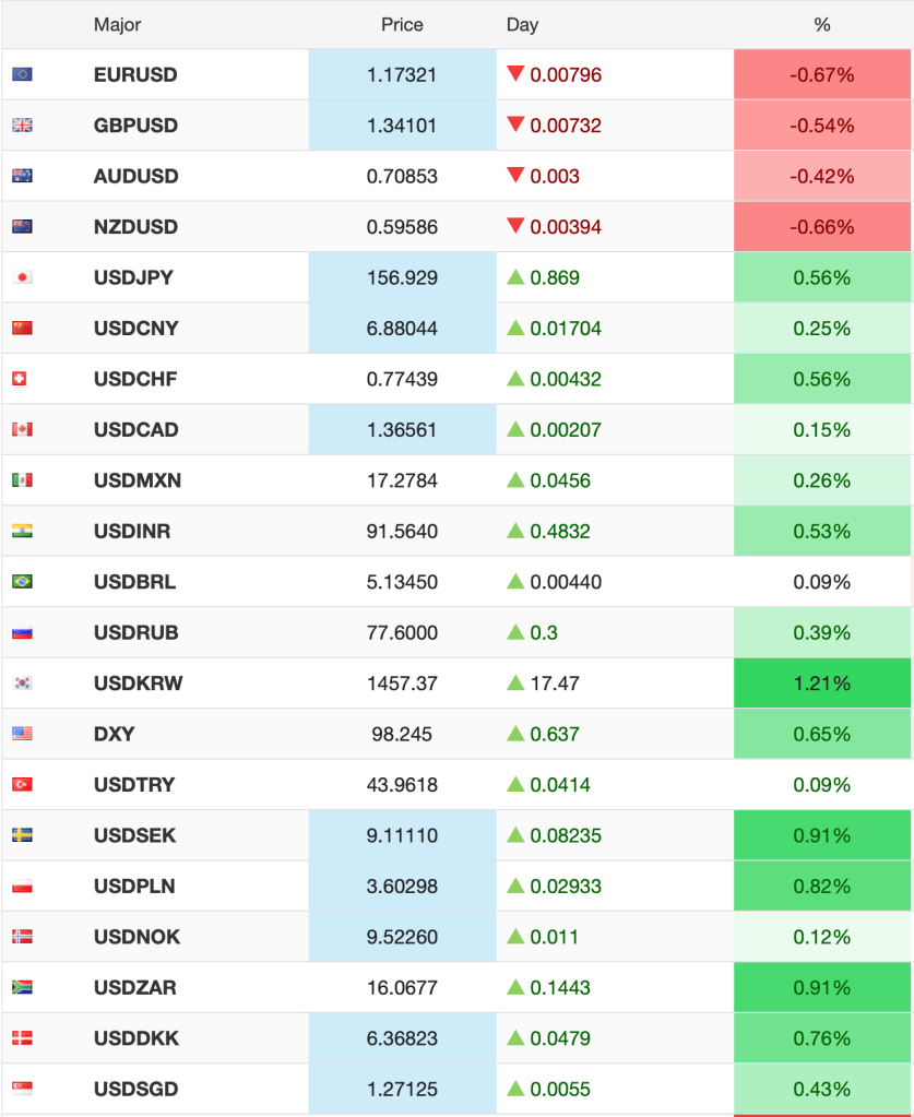 The other two traditional haven assets are the dollar and Treasury bonds so let’s look at them next.  Starting with the dollar, it has done what it regularly does in an uncertain situation, it has rallied sharply.  As you can see from the below table, shot at 6:39 this morning, the dollar is firmer against every single major currency this morning.