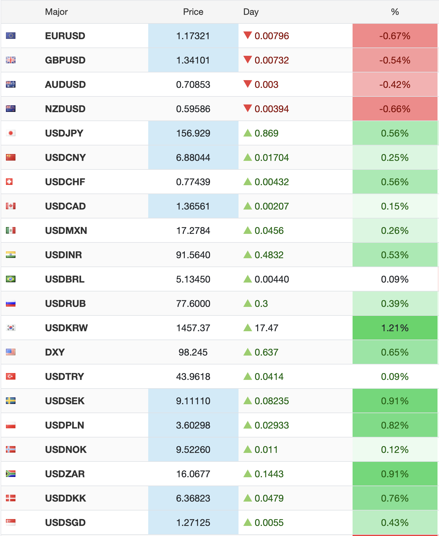 The other two traditional haven assets are the dollar and Treasury bonds so let’s look at them next.  Starting with the dollar, it has done what it regularly does in an uncertain situation, it has rallied sharply.  As you can see from the below table, shot at 6:39 this morning, the dollar is firmer against every single major currency this morning.