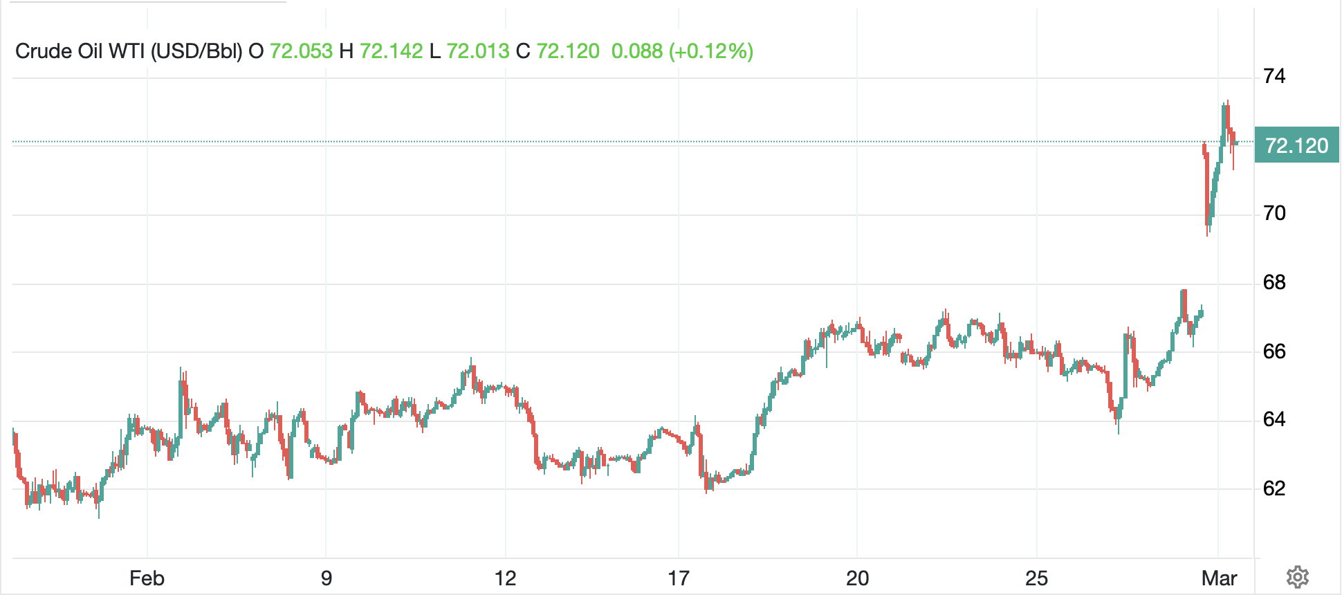 Not surprisingly, we have seen some large moves across markets, and largely in the direction one would have expected regarding risk.  So, oil prices (+7.5%) have exploded higher as shipping through the Strait of Hormuz has ceased for now and there is no timeline for it to reopen.  Given ~20% of the daily global consumption of oil flows through that waterway, there should be no surprise here.  You can see from the chart below that as concerns grew regarding military action, oil’s price climbed and then, of course, gapped on the opening last night.
