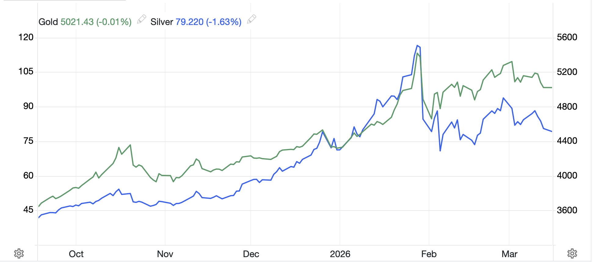In the metals markets, gold (0.0%) is trading just above $5000/oz and silver (-1.6%) just below $80/oz, and neither has responded as would have been expected prior to the Iran conflict. Recall, both peaked at the end of January, just before the Kevin Warsh as Fed chair announcement, and as you can see below, both have largely gone nowhere, albeit with a lot of daily volatility attached to that lack of movement.