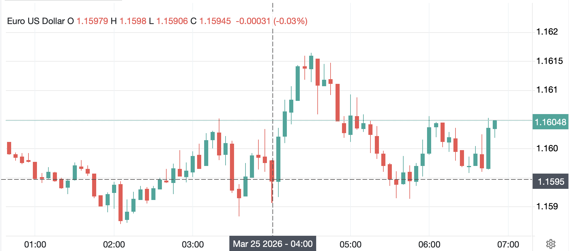 The interesting thing about this, to me, is how little the FX market seemed to care about her comments. A look at the chart below of intraday price action with 5-minute candles, shows that her comments were enough to push the euro higher by…20 pips! And that lasted for about 90 minutes.