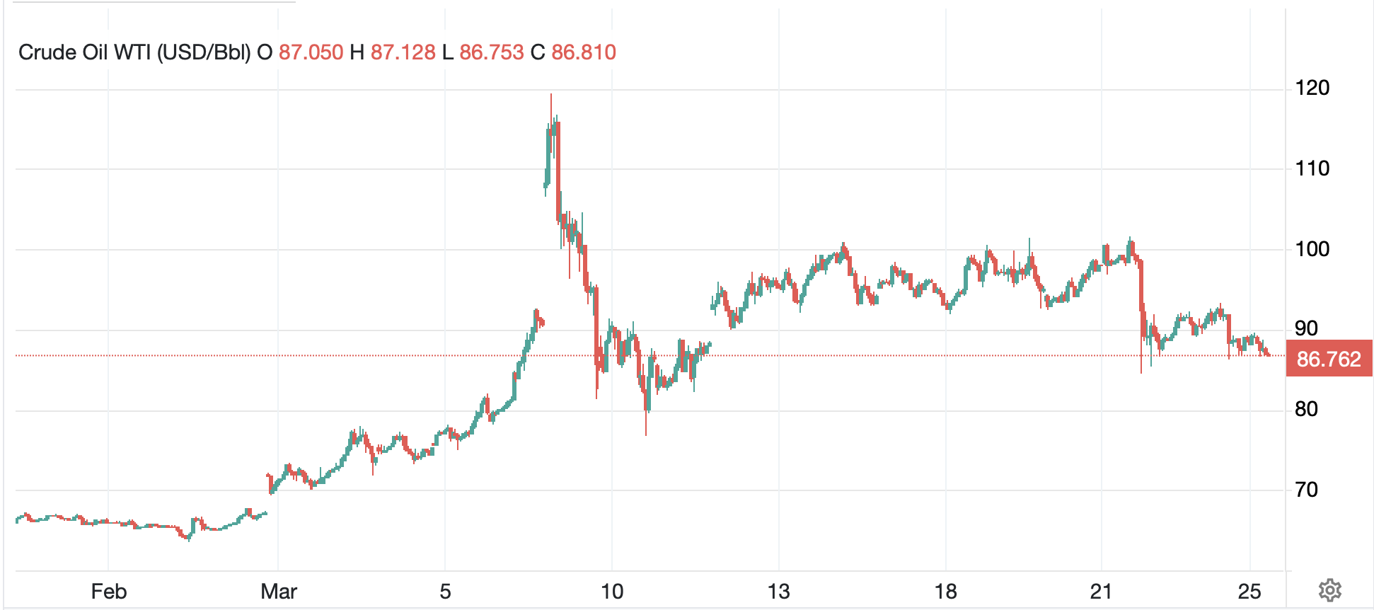 At this point, oil has retraced a bit over 50% of its initial spike. Market technicians will be looking at the $84.95 level as the next key Fibonacci retracement level, with a break below there likely to convince some that lower prices are the future.