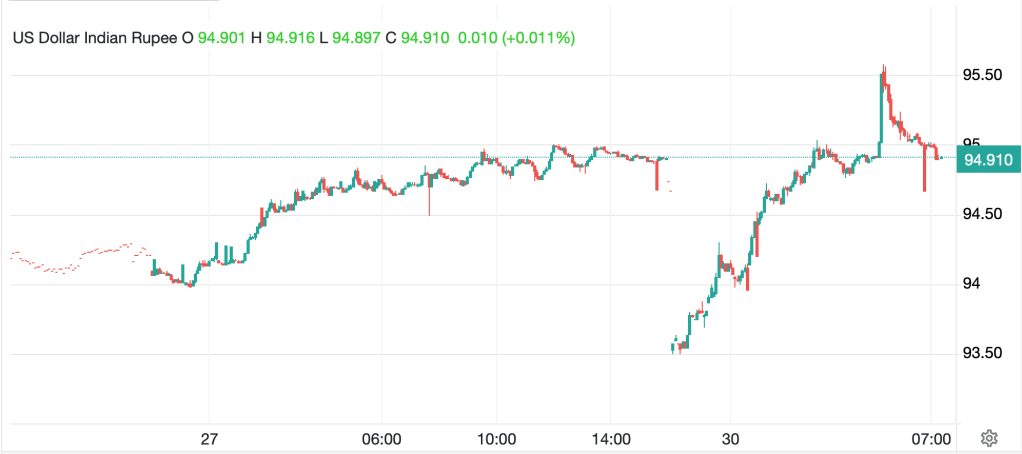 In the FX markets, the story has been more mixed this morning with the dollar broadly firmer, but not universally so. In the G10, the yen (+0.5%) is the outlier as having traded above the 160.00 level Friday, we heard more from Japanese authorities, specifically, the current Mr Yen, Mimura-san, that they did not welcome speculative trading and would address it if they believed that was driving the yen weaker than it should be. Given the dollar is firmer vs. all its other G10 counterparts over the past month, it is surprising that is the case they are trying to make, but I guess they need to say something. Otherwise, this bloc is mostly softer by about -0.2% or so across the board. In the EMG bloc, INR had a little hiccup last night as per the chart below.