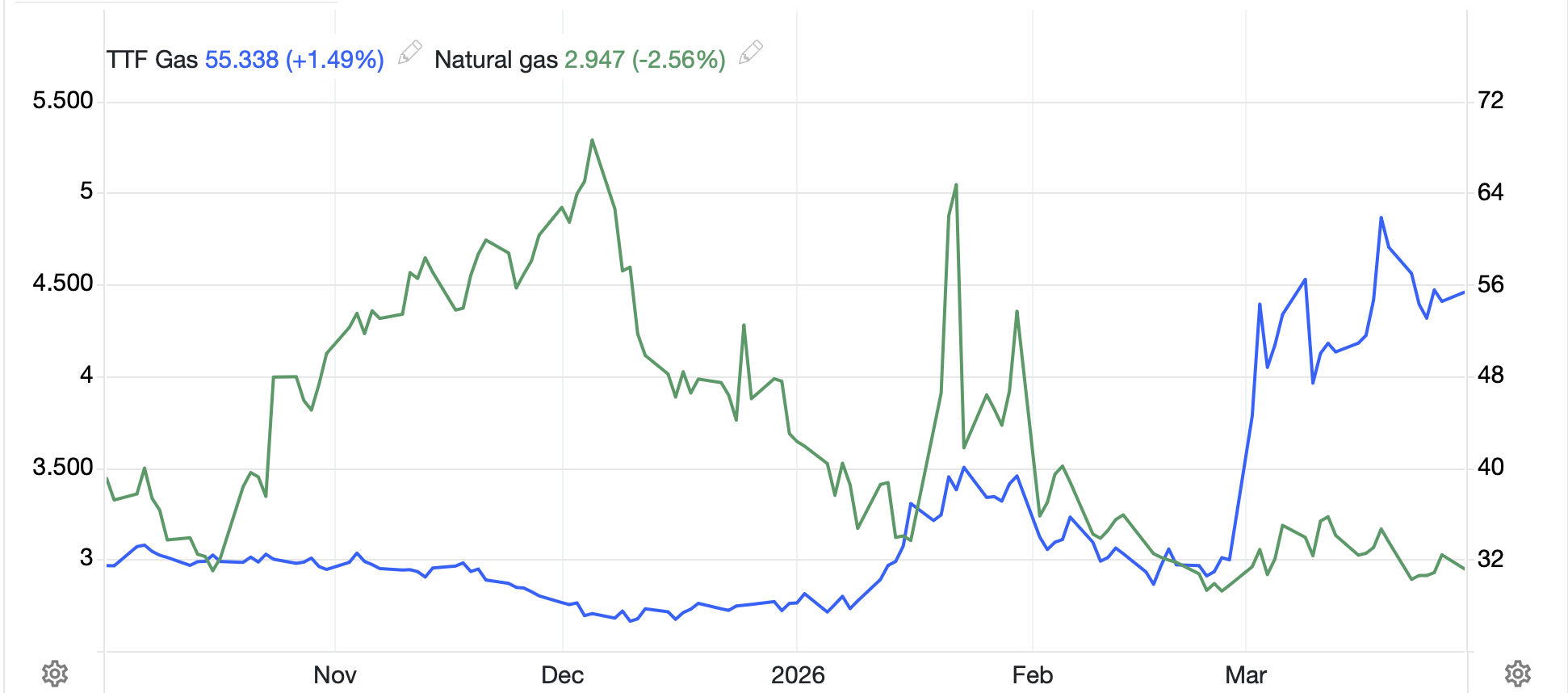 As I was considering the implications of oil prices at $100/bbl in the US, I realized that every fracking well in the US is going to be pumping at maximum capacity, and given how quickly DUC (drilled but uncompleted) wells can be brought on line, I expect that we will see US oil production rise from its recent 13.7 million bbls/day. But alongside that, many, if not most, of these wells will be producing associated gas, i.e. natural gas that comes up with the oil, which is one reason, I believe, that Natural Gas prices in the US (-2.5% today) are essentially unchanged since the war began a month ago (green line). Meanwhile, as you can see with the blue line on the chart, European Natural Gas prices have exploded higher. In fact, this morning, US prices are just below $3.00/MMBtu while European prices are about $18.65/MMBtu. (European gas is quoted in EUR/MWh, which is why the price looks so different.). Europe needs this war to end a lot sooner than the US from a pure economic perspective.