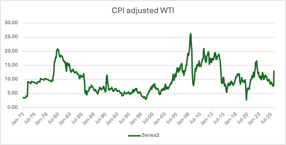 However, on this topic, as most of us live and think in a nominal world, we consider $100/bbl as extremely expensive. But if we take a moment to consider the real (inflation adjusted) price of oil, we can see in the chart below that energy remains pretty cheap, and well below levels seen ahead of the GFC or even in the wake of the Russian invasion of Ukraine.