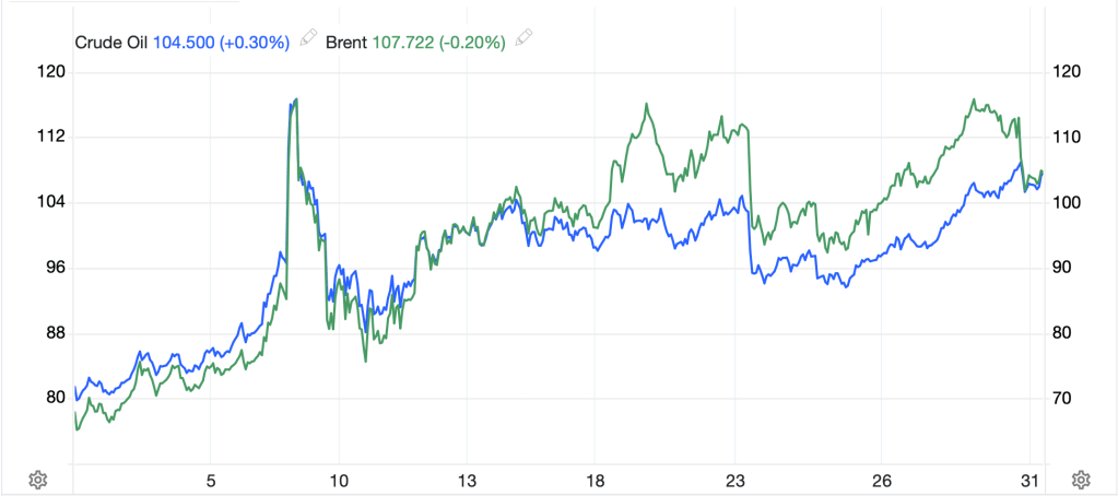 One interpretation of that price action is that there is a growing belief that the Strait will reopen for transit soon. Of course, it could simply be that neither Brent nor WTI are representative of the oil grades that are impacted, and thus the large premium no longer makes sense, but given the totality of the news, I’m inclined to lean toward the former idea. Of course, both benchmarks are currently solidly above $100/bbl so still causing great pain.