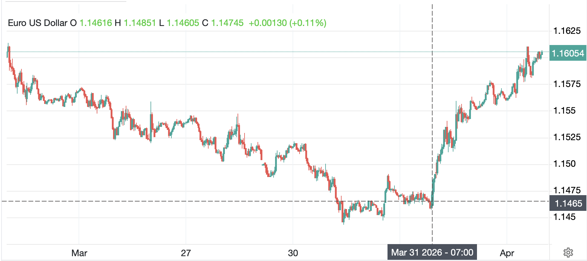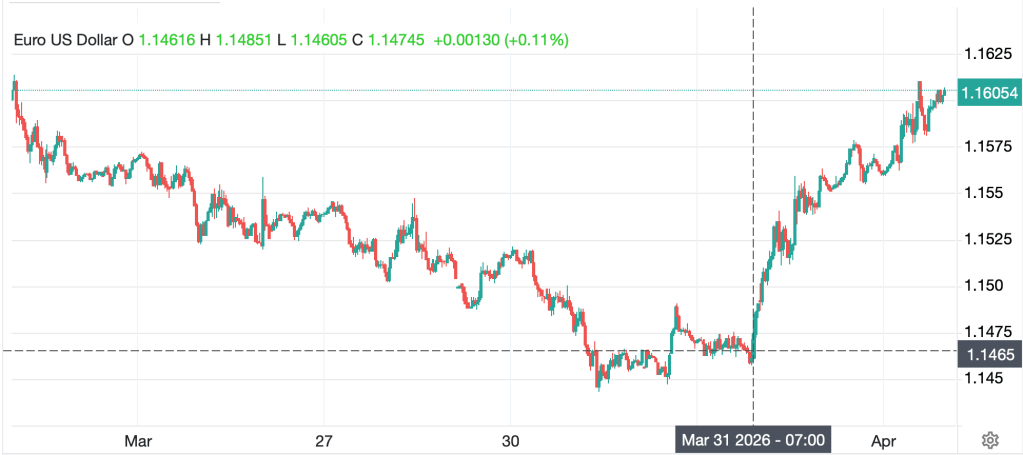 I’ve already discussed most market segments, leaving just currencies untouched at this point.  Given the reversal in views, we cannot be surprised that the dollar, which has been a major beneficiary of the war, has reversed its recent price action as well.  In fact, using the euro as our proxy, we can see in the below chart that the reversal started at 7:00am yesterday morning and the single currency has rebounded by 1.25% since then.